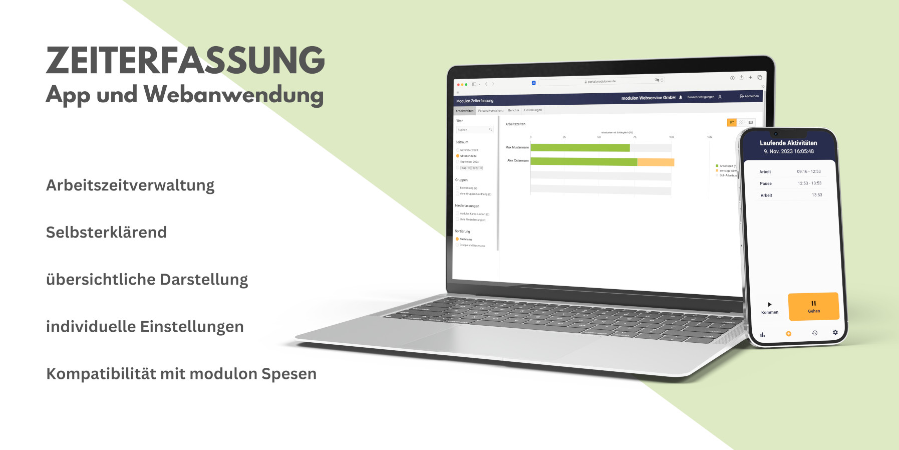 Mit unserer modulon App ZEITERFASSUNG bieten wir Ihnen eine ebenso effiziente wie komfortable Lösung für das im Arbeitsschutzgesetz (ArbSchG) § 3, Absatz 2, Nummer 1 vorgeschriebene Erfassen der Arbeitszeiten. Über die App können Ihre Mitarbeiter die Arbeitszeiten digital, ortsunabhängig und rechtskonform einfach über ein mobiles Endgerät eintragen. Für die Personalabteilung sind die über die App erfassten Einträge in der modulon Webanwendung übersichtlich dokumentiert und können für die Weiterverarbeitung per Mausklick exportiert werden.