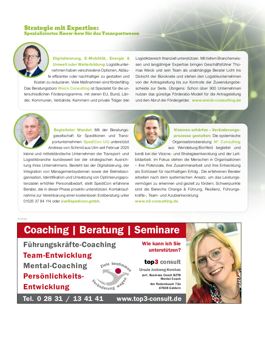 Auf betriebliche Besonderheiten in der Transport- und Logistikbranche spezialisierte Experten können effizient bei allen Schritten unterstützen. Von der Analyse über die individuelle Beratung bis zur Umsetzung und Nachbetreuung übernehmen die Spezialisten eine entscheidende Funktion, damit anstehende Veränderungen auch wirklich ein Erfolg werden.